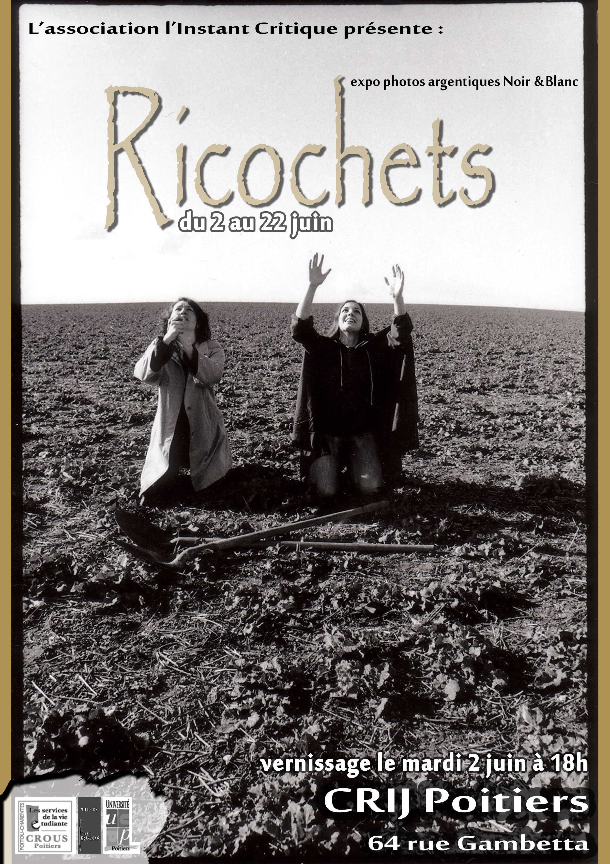 Vous avez peut-être eu un aperçu du projet de l’association l’Instant Critique dans l’exposition « Polyptyques » à l’hôtel de ville. L’exposition complète sera montrée sous le nom de « Ricochets » au Crij de Poitiers (rue Gambetta) du 2 au 22 juin. Le vernissage aura lieu, lui, le 2 à 18h. A tous les afficionados de la photographie argentique ou bien même aux simples curieux, je vous invite chaleureusement à passer nous faire un petit coucou !