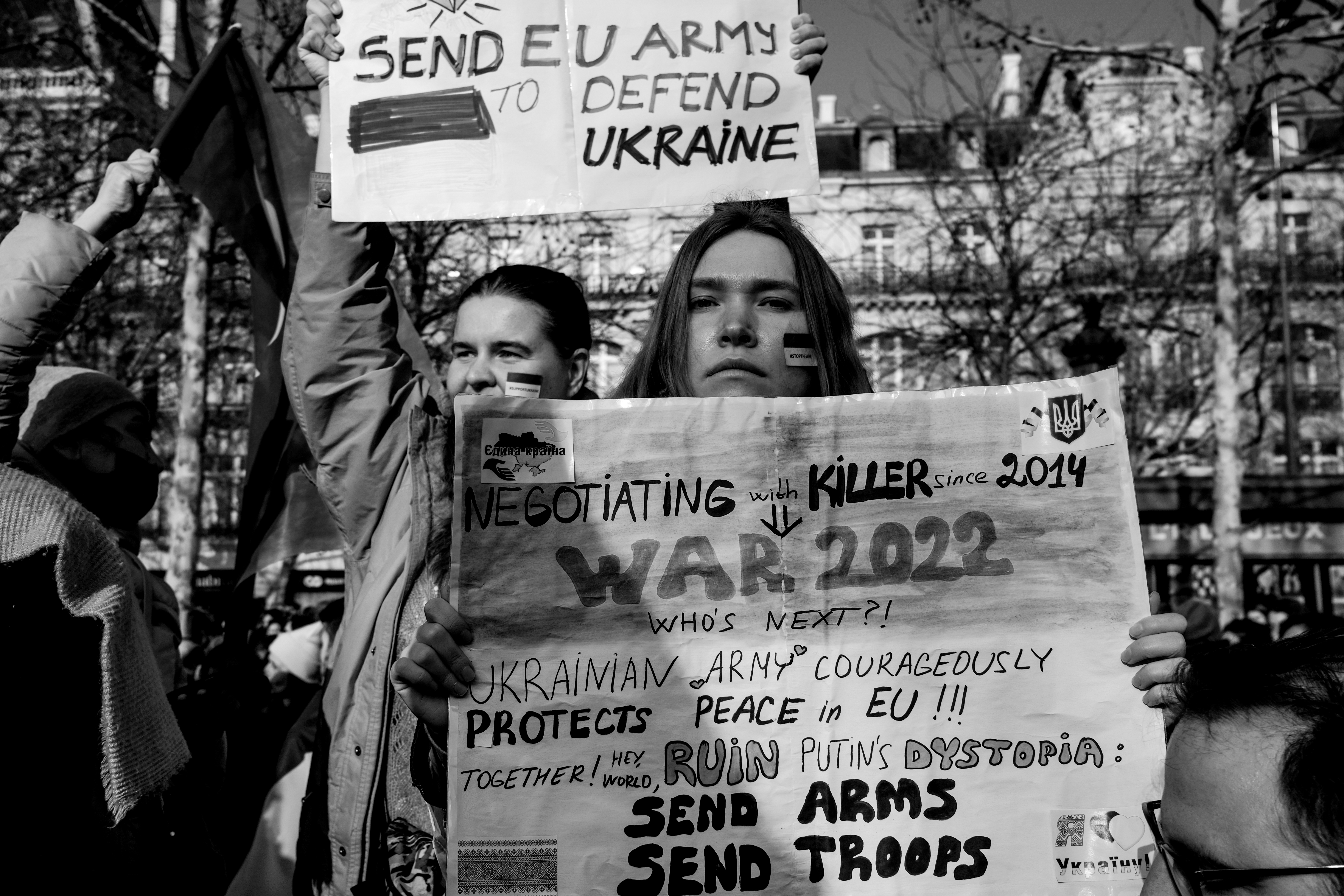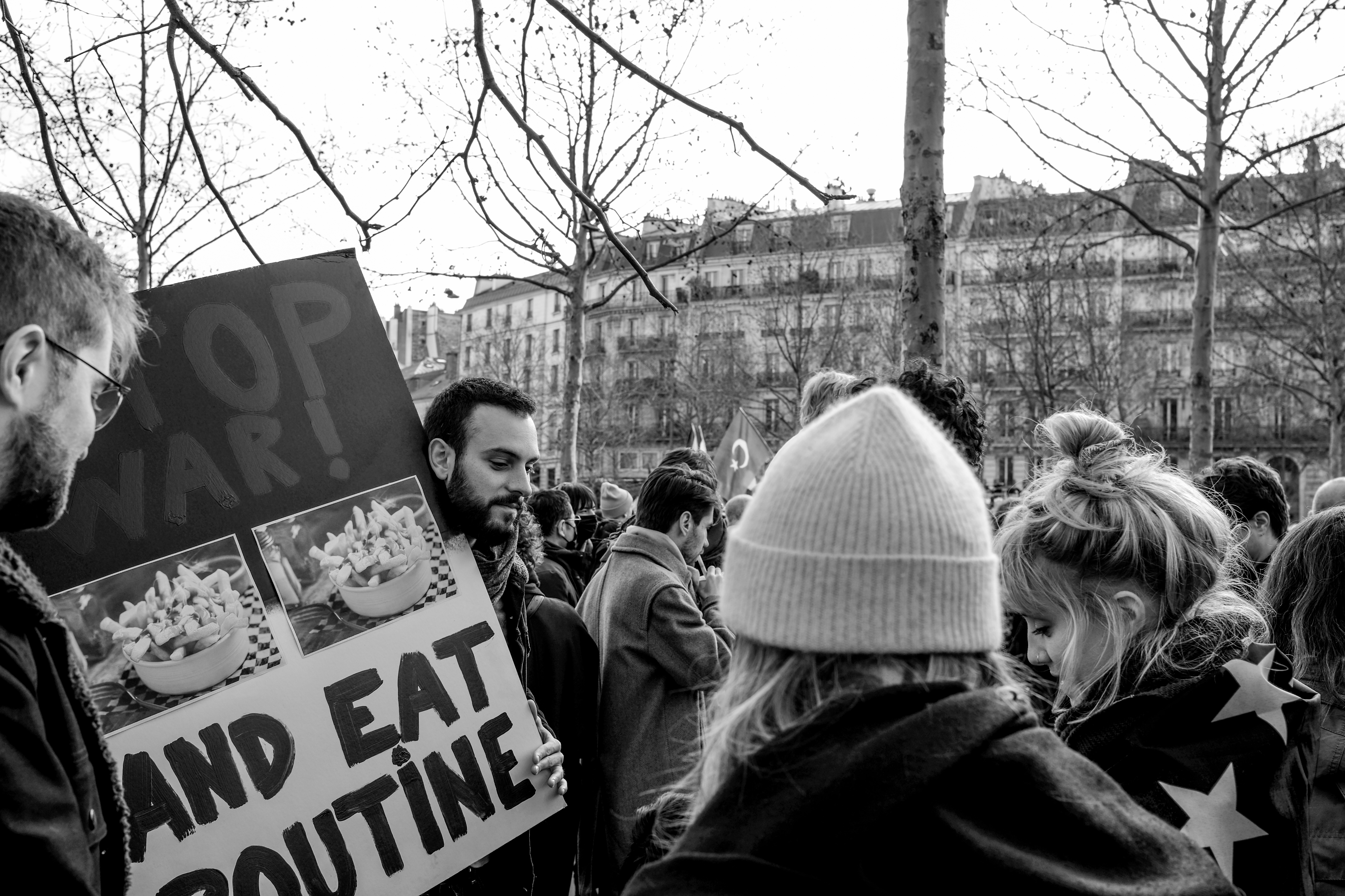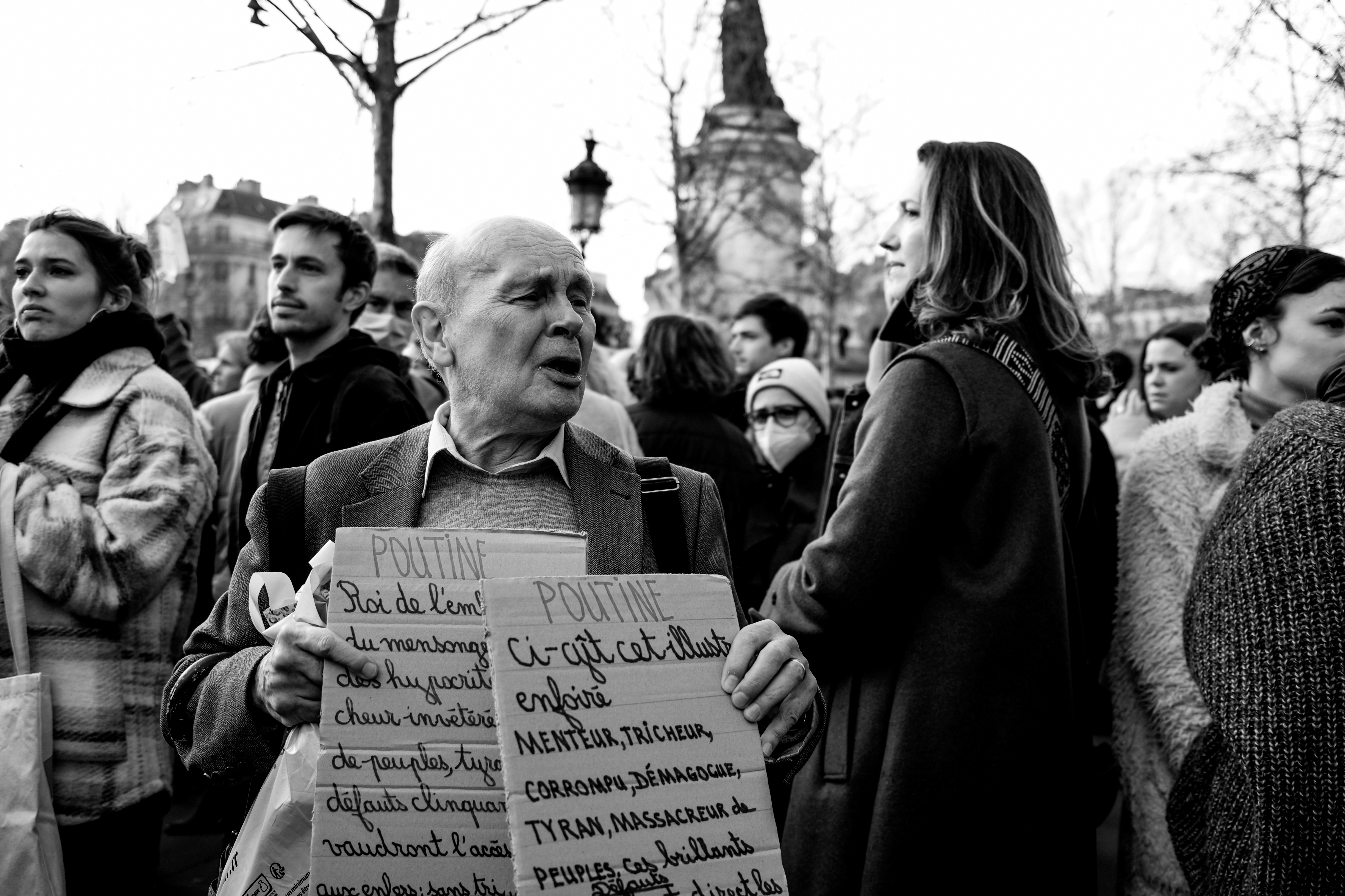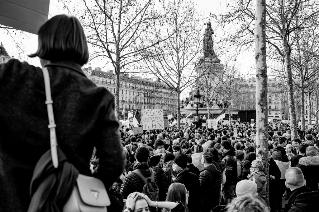 Pour le reste, c’est l’habituel mélange hétéroclite de la manifestation. Du Russe, de l’Ukrainien, du Tunisien venu protester contre la « dictature tunisienne » aussi. Si beaucoup de gens appelaient à « stopper la guerre », tous ne s’entendent pas sur la façon d’y parvenir… Car ce n’était pas spécialement un rassemblement pacifiste. Nombreuses étaient les pancartes appelant de leurs vœux l’implication militaire des pays européens (et de la France) en Ukraine. Pur et simple, ou par le moyen d’une zone d’exclusion aérienne, tant réclamée par le président ukrainien, mais qui est un engagement au combat puisqu’elle implique d’abattre des avions russes.